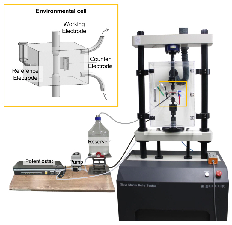 : Versa stat II)๋ฅผ ์ฌ์ฉํ์ฌ 1 mVs-1์ ์ฃผ์ฌ์๋๋ก ๋์ ์ ๋ถ๊ทน์คํ(potentio-dynamic polarization)์ ์งํํ์๋ค. ์ธ๊ณตํด์๋ ASTM D1141-98์ ์๊ฑฐํ์ฌ
