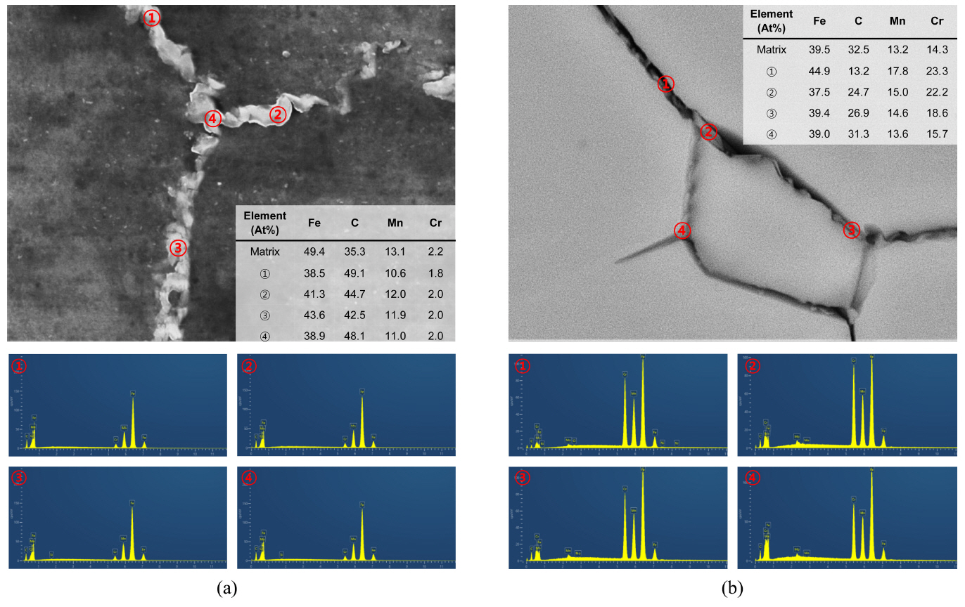 M7C3 ํํ์ ํํ๋ฌผ์ด ์กด์ฌํ๋ฉฐ, ํฌ๋กฌ๊ณผ ์ง์์ ํจ๋์ด ๋์ Fe19Mn19Cr0.6N๊ฐ์ ๊ฒฝ์ฐ์๋ M23C6 ํํ์ ํํ๋ฌผ๊ณผ Cr2N ์์ถ๋ฌผ์ด ์กด์ฌํ๋ ๊ฒ์ผ๋ก ํ์ธ๋์๋ค.