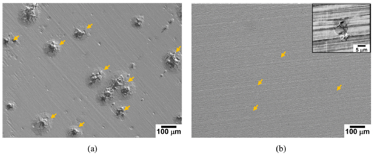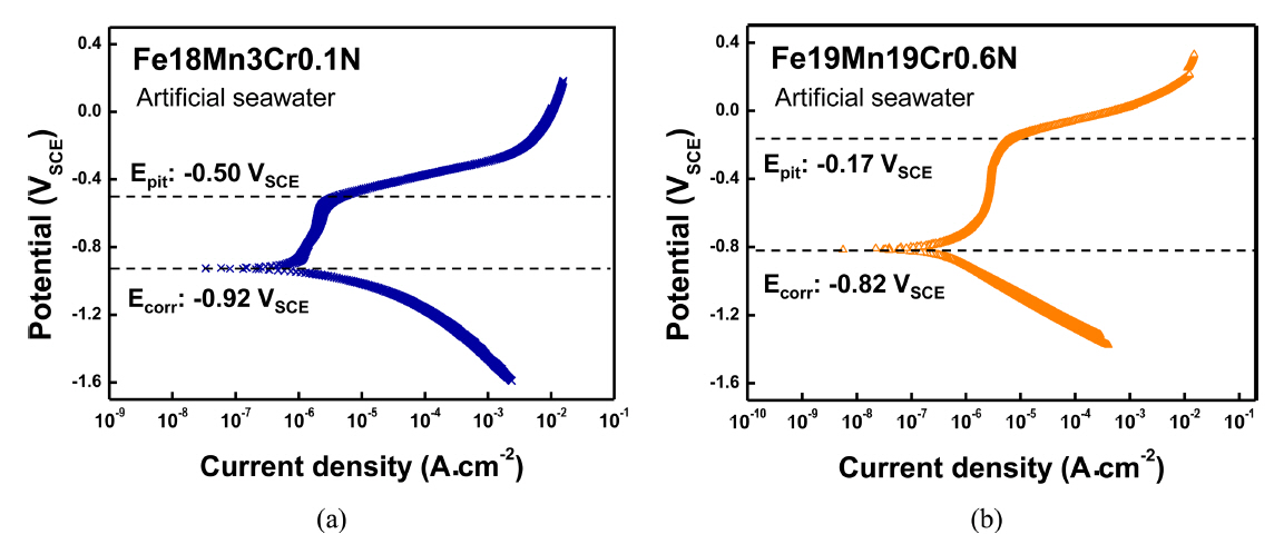 ๊ทธ๋ฆผ 5์ 6์ ์ธ๊ณตํด์๋ถ์๊ธฐ์์ (a) Fe18Mn3Cr0.1N๊ฐ๊ณผ (b) Fe19Mn19Cr0.6N๊ฐ์ ๋ํ์ ์ธ ๋ถ๊ทน์ํ ๊ณก์ (๊ทธ๋ฆผ 5) ๋ฐ ์ํ ํ ํ๋ฉด์ SEM์ ์ด์ฉํ์ฌ ๊ด์ฐฐํ ์ฌ์ง(๊ทธ๋ฆผ 6)์ ๋ณด์ฌ์ฃผ๊ณ ์๋ค. Fe18Mn3Cr0.1N๊ฐ์ ํฌ๋กฌ๊ณผ ์ง์ ํจ๋์ด ์ฆ๊ฐํจ์ ๋ฐ๋ผ ๋ถ์์ ์๋ -0.92์์ -0.82 VSCE๋ก ๋ค์ ์ฆ๊ฐํ๋ ๊ฒฝํฅ์ ๋ํ๋ด์์ผ๋, ํผํ