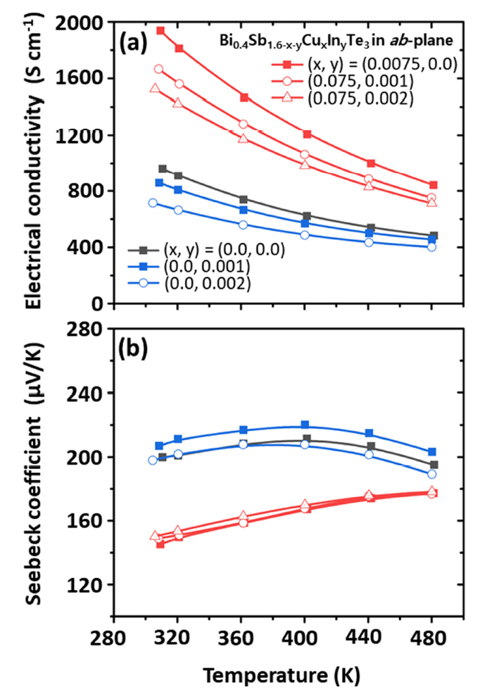 In/Cu 도핑에 따른 전기전도도, 제벡계수의 온도에 따른 변화는 그림 2와 같다. In만 도핑한 경우 (그림 2 내 파란색 선) In 도핑량이 증가함에 따라 전기전도도는 감소하였고 전기전도도와 제벡계수의 상쇄관계에 의해 제벡계수는 증가하는 것을 관찰할 수 있다.