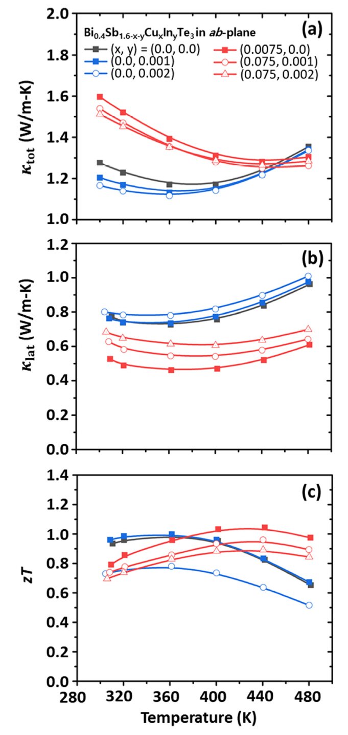 (a) Total thermal conductivity, (b) κlat (κlat includes κbip), and (c) zT as a function of temperature for the Bi0.4Sb1.6-x-yCuxInyTe3 (x=0.0, 0.0075, y=0.0, 0.01, 0.02).