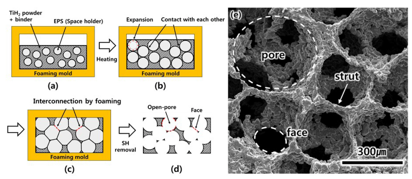 65%)을 확보하기 어렵다는 단점이 있다 [4,21-23]. 만일 발포가 가능한 스페이스 홀더를 사용한다면 스페이스 홀더를 팽창(발포)시킴으로써 이들 사이의 접촉 수 및 접촉 면적을 증가시킬 수 있다.