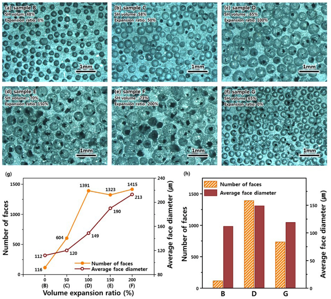 준비하였다 (그림 3(a), (c), 및 (f)). 이들 시편 내에 생성된 페이스의 수와 크기를 이미지 분석을 통해 정량화하여 그림 3(h)에 나타내었다. 스페이스 홀더를 발포시키지 않은 B와 G 시편으로부터 스페이스 홀더의 양이 증가함에 따라 페이스의 수는 증가하지만 페이스의 크기는