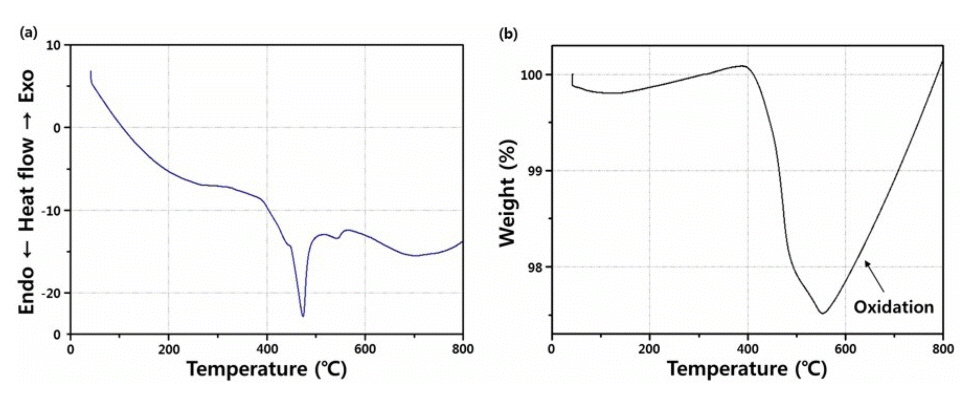 TiH2는 고온에서 Ti과 H2로 분해되는 상변태를 일으킨다. 본 연구에서 사용한 TiH2 분말의 탈수소화 거동을 확인하 기 위해 Ar분위기(유속 50 ml min-1) 내에서 1 °C/min의 승온 속도로 DTA 및 TGA를 사용하여 열분석(SDT Q600) 하였으며, 그 결과를 Appendix의 그림 I에 나타내