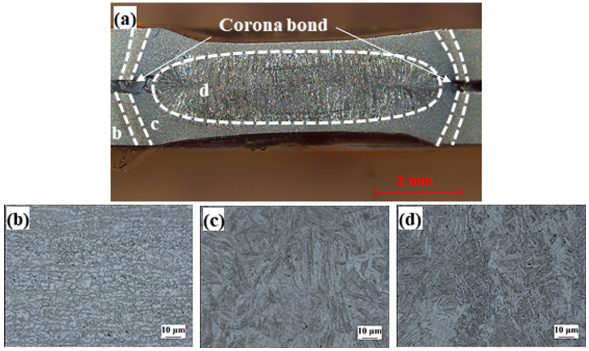 heat affected zone)์ ์ฝ๋ก๋ ๋ณธ๋(corona bond)๊ฐ ๊ด์ฐฐ๋์๋ค. ๊ทธ๋ฆผ 3(b)๋ ๋ชจ์ฌ ์์ญ์ผ๋ก (๊ทธ๋ฆผ 3(a)์ โbโ ํ์์์ญ) ํฐ์์ ํ๋ผ์ดํธ(ferrite)์์ ๋น๋กฏํ์ฌ ๋ฒ ์ด๋์ดํธ(bainite)์ ๋ง๋ฅดํ