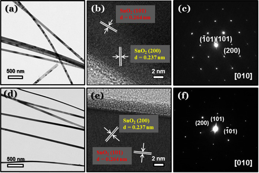 TEM (HRTEM) images of SnO2 nanowires with shell thicknesses of 5 nm and 10 nm are shown in Fig 3(b) and 3(e), respectively. In both cases, lattice fringes with spacings of 0.264 nm and 0.237