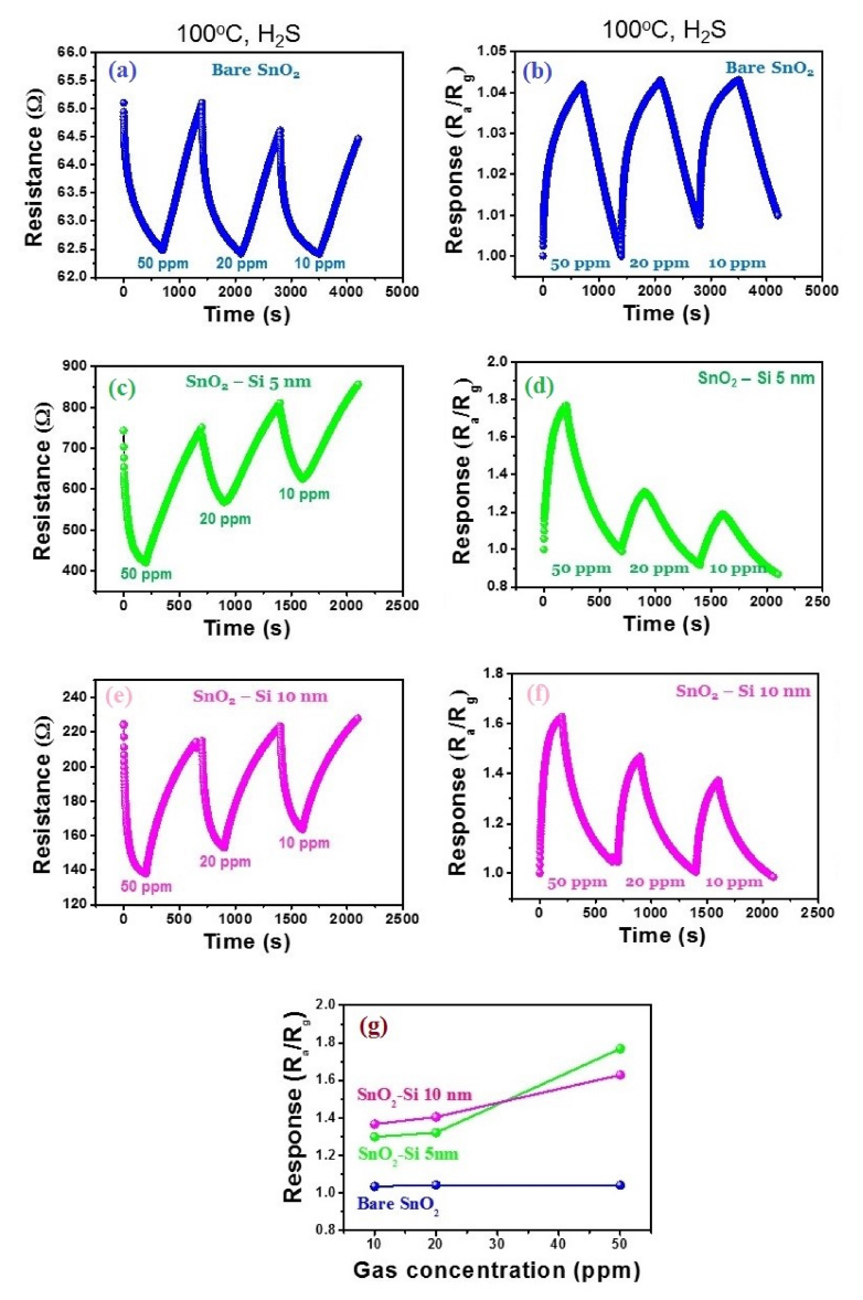 at 100 °C. Fig 5 shows the H2S sensing properties of bare and Si-coated SnO2 nanowires. The dynamic response plots of bare SnO2 nanowires for 10, 20, and 50 ppm of H2S gas are shown in Fig 5(a). Upon exposure to H2S gas, the resistance of the sensor decreased, reflecting its n-type behavior. Furthermore,