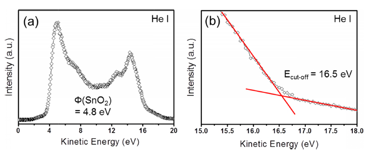 to each work function value. Accordingly, the work function of the SnO2 nanowire was calculated to be 4.8 eV (= 21.2 eV – 16.5 eV + 0.1 eV). Previous studies