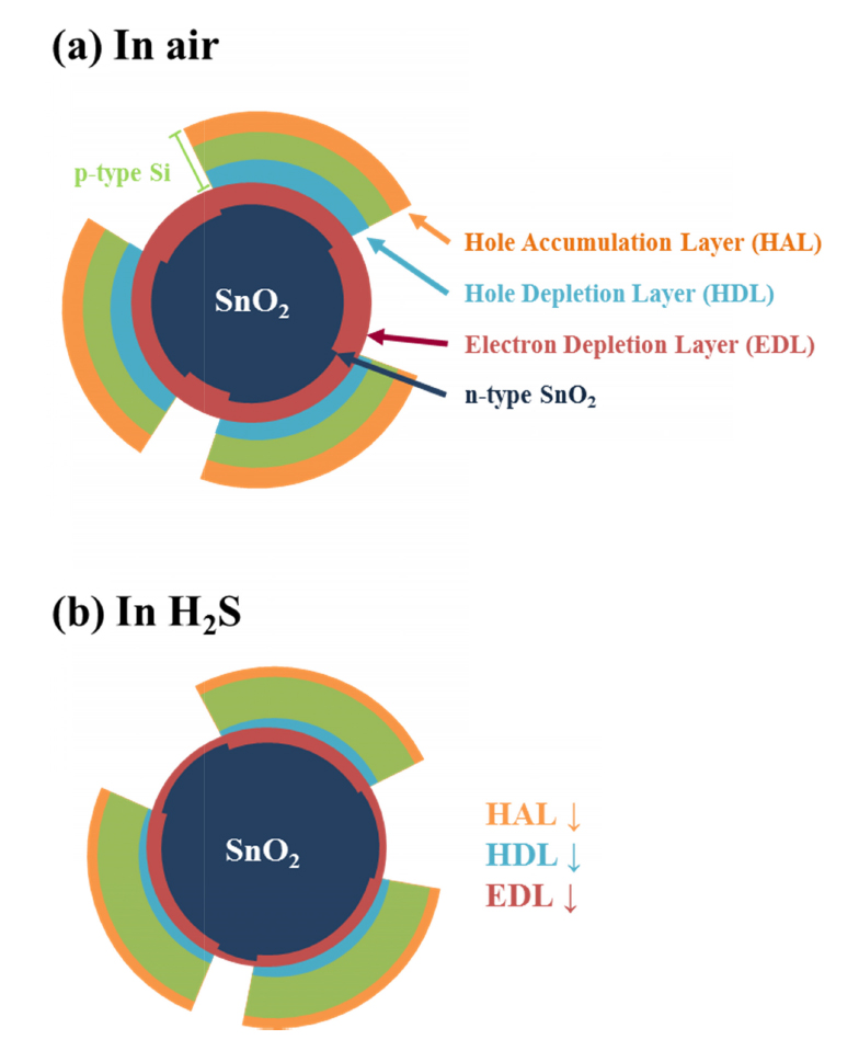 depletion layer, and an electron depletion layer were formed (see Fig 9(a)). As shown in Fig 9(a), the hole and electron depletion layers were formed on the p-Si and n-SnO2 sides, respectively, at the interface between p-Si and n-SnO2. Upon exposure to H2S, electrons returned to the surface of the sensing layer, decreasing the width of