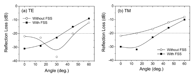 특성 결과이다. 입사각이 증가함에 따라 흡수 주파수 대역의 변화는 크게 없다. TE 편파의 경우, FSS를 부착했을 때 20 dB 흡수율 기준 입사각의