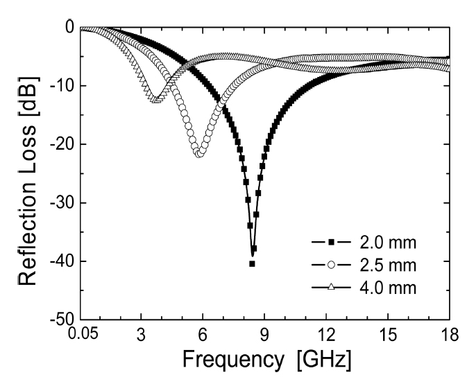 –13 dB 수준의 반사손실을 보이며, 2 mm 두께에서는 8.4 GHz에서 –40 dB의 반사손실을 보인다. 이로부터 임피던스 정합이 일어나는 정합두께는