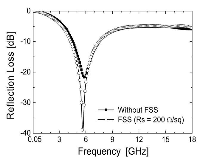 면저항 Rs = 200 Ω/sq의 FSS 부착 후에는 반사손실이 –40 dB로 크게 감소하여 FSS의 부착 효과가 뚜렷함을 볼 수 있다.