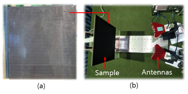 본 연구에서 사용된 반사손실 측정방법은 자유공간법(free space measurement method)으로 그림 7(b)에 나타내었다. 측정장비는 Agilent E8364B PNA network analyzer, 혼 안테나는 ETS-LINDGREN 3117 model이었다.