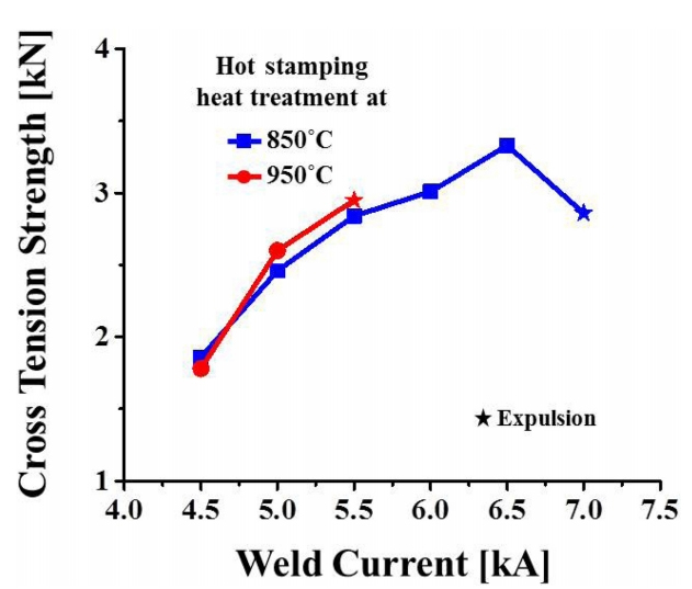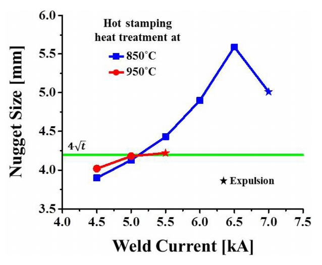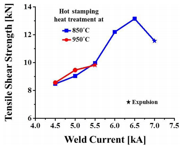 ๊ทธ๋ฆผ 2๋ ์ฉ์ ์ ๋ฅ์ ๋ฐ๋ฅธ Al-10% Si๋๊ธ ํซ์คํฌํ๊ฐ์ ๋๊ฒ๊ฒฝ (Nugget Diameter)์ ์ธก์ ํ์ฌ ๋ํ๋ธ ๊ฒ์ด๋ค. 850 oC ์ด์ฒ๋ฆฌ ์ํธ์ ๋๊ฒ๊ฒฝ์ด ์ ๋ฅ๊ฐ ์ฆ๊ฐํจ์ ๋ฐ๋ผ ์ฆ๊ฐํ๋ค๊ฐ 7.0 kA์์ Expulsion์ด ๋ฐ์ํ๋ฉด์ ๊ฐ์ํ์๋ค. ๊ฐ์ฉ์ ๋ฅ๊ตฌ๊ฐ์ ๊ฒฝ์ฐ, 850