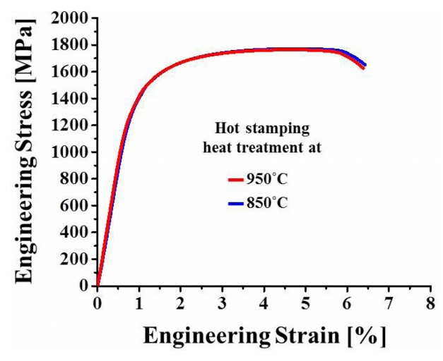 ๊ฐ๋ํ๋ณด์ฌ๋ถ, ์ด์ฒ๋ฆฌ ์จ๋์ ๋ฐ๋ฅธ ๋ชจ์ฌ์ ๊ธฐ๊ณ์ ๋ฌผ์ฑ ์ฐจ์ด ์ฌ๋ถ๋ฅผ ํ๋จํ๊ธฐ ์ํ์ฌ ์ธ์ฅ์ํ์ ํ์๋ค. ๊ทธ๋ฆผ 7๋ ํซ์คํฌํ ์ด์ฒ๋ฆฌ ์จ๋๊ฐ 850 oC์ 950 oC์ผ ๋ ๊ธฐ๊ณ์ ๋ฌผ์ฑ์ ๋ํ๋ธ Engineering Stress-Strain curve์ด๋ค. ์ธ์ฅ๊ฐ๋ (Ultimate Tensile Strength,