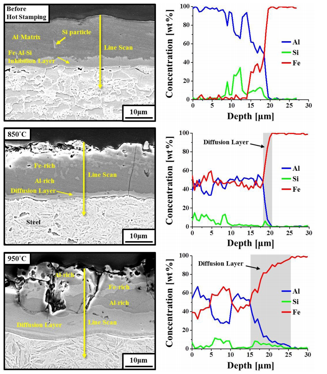 ๋ชจ์ฌ์ ๋๊ธ์ธต ์ฌ์ด์๋ Fe-rich Diffusion layer๊ฐ 2 ฮผm ๋๊ป๋ก ํ์ฑ๋์ด์๋ค. ํซ์คํฌํ ์ด์ฒ๋ฆฌ๋ฅผ 950 oC์์ ์งํํ ๊ฒฝ์ฐ, ๋๊ธ์ธต์ ๊ฐ 5 ฮผm ๋๊ป์ Al-rich, Fe-rich, Al-rich ์์ผ๋ก ์ฐ์์ ์ธ ์ธต์ผ๋ก ๊ตฌ์ฑ๋๊ณ 10 ฮผm ๋๊ป๋ก