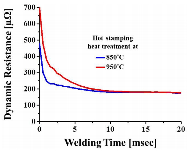 ๋๊ธ์ธต์ ๊ตฌ์ฑํ๋ Fe-Al ๊ธ์๊ฐํํฉ๋ฌผ์ ์๋ถ์จ์ ๋ฐ๋ผ ์ค์ ์ ์ฉ์ ์ ์ฐจ์ด๊ฐ ๋ฐ์ํ๋์ง ํ๊ฐํ๊ธฐ ์ํ์ฌ 850 oC์ 950 oC์์ ์ด์ฒ๋ฆฌ๋ ์ํธ์ ๋์ผ ์ฉ์ ์กฐ๊ฑดํ์ ๋์ ํญ(Dynamic Resistance)์ ์ธก์ ํ์๋ค (๊ทธ๋ฆผ 9). ์ ์ฉ์ ์ 950 oC ์ด์ฒ๋ฆฌ ์ํธ์ ์ต๋ ์ ๋ฅ์กฐ๊ฑด์ธ 5.5 kA ์ ๋ฅ์กฐ๊ฑด์์ ์ค์ํ์๋ค. ๋ ์ํธ์ ๋์ ํญ ๊ณก์ ์ ๋น๊ตํด๋ณด๋ฉด ์ด๊ธฐ 10 msec ๋์ ํฐ ์ฐจ์ด๋ฅผ ๋ณด์ด๊ณ