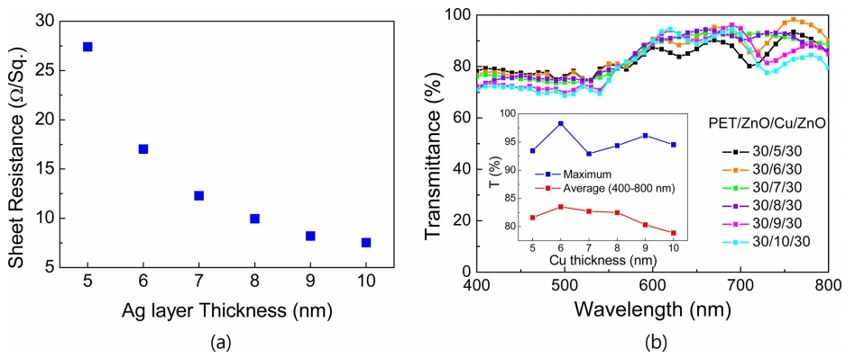 (a) Sheet resistance of Cu films as a function of Cu thickness for PET/ZnO /Cu/ZnO,