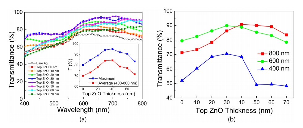 증가하다가 그 후에 급격하게 감소하는 경향을 보였다. 이러한 특징으로 인해 상부 ZnO 층의 두께가 40 nm 일 때 가장 높은 가시광선 평균 투과도인