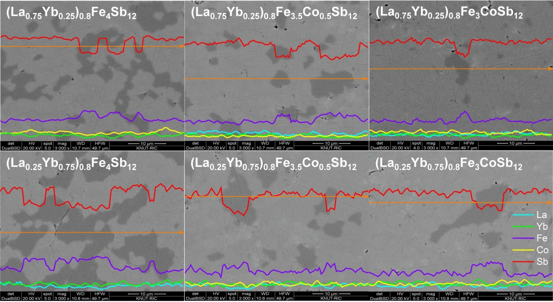 SEM images and EDS line scans of (La1−zYbz)0.8Fe4−xCoxSb12.