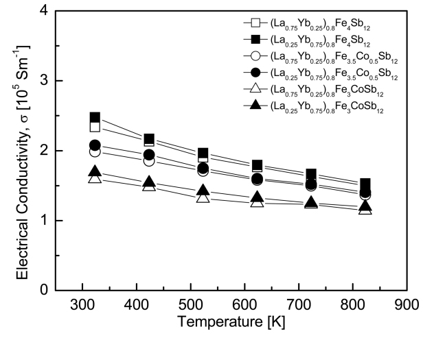 Figure 3 presents the temperature dependence of electrical conductivity for (La1−zYbz)0.8Fe4−xCoxSb12. All specimens showed degenerate semiconductor behavior with decreasing electrical