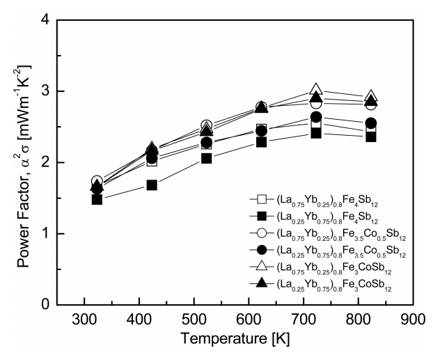 (La1−zYbz)0.8Fe4−xCoxSb12. As the temperature increased, the power factor increased and reached the maximum