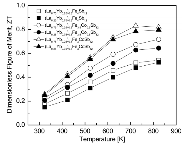 Temperature dependence of the ZT for (La1−zYbz)0.8Fe4−xCoxSb12.
