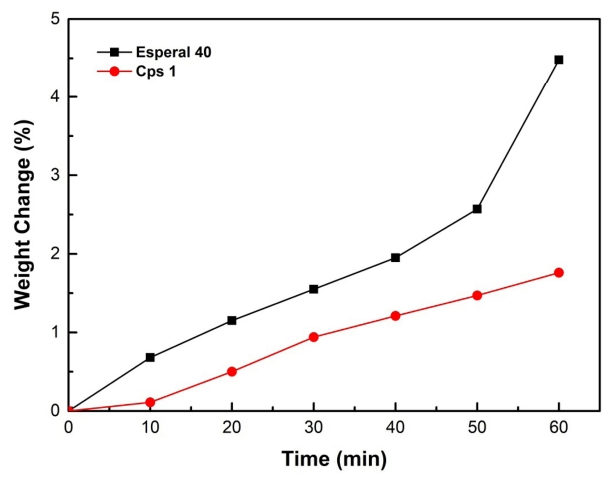 그림 10은 인공사 Esperal 40, Cps 1에 코팅된 CBAPC_4.5로 제조된 시험편을 동일한 노출 조건 (온도: 20 oC, 상대습도: 30%)에서 노출 시간에 따른 중량 변화를 나타냈다. 노출 시간 10분 후에는 Esperal 40, Cps 1의 시험편 중량은 2.0,