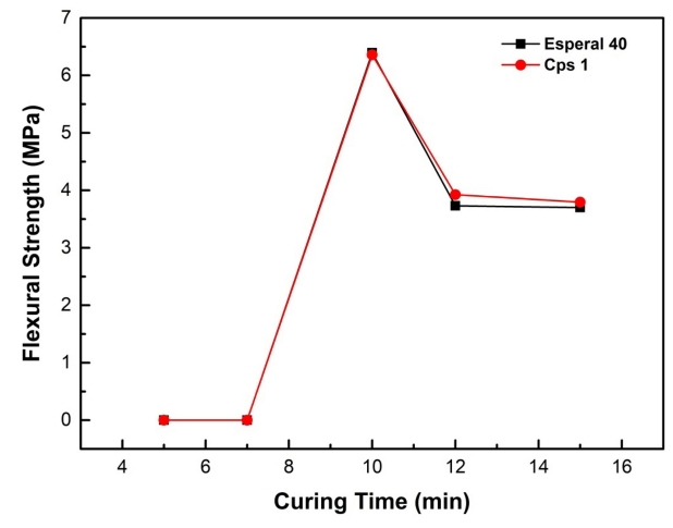 그림 13은 경화 시간에 따른 인공사 Esperal 40, Cps 1에 코팅된 CBAPC_4.5로 제조된 시험편의 항절 강도 분석 결과를 나타냈다. Esperal 40, Cps 1은 260 oC에서 10분 경화 시 최대 강도 6.40, 6.36 MPa를 나타냈다. 경화시간이 5분에서 7분으로 경과함에 따라 CBAPC_4.5 내 존재하는 많은 함량의 인산을 증발시키기 위한 건조 시간이 부족하여 시험편의 제조가 어려운 경향을 관찰하였다. 경화 시간이 10분에서 15분으로