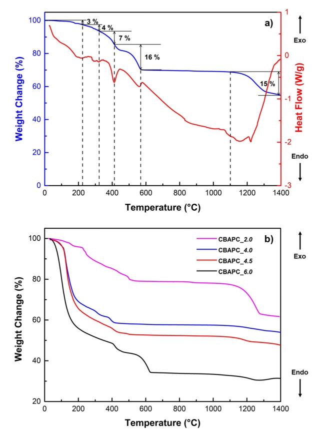 사용한 것으로 보아 현재 연구와는 상이한 결과가 나타났다. 그러나 470 oC 부근에서 Al(PO3)3 상 관찰로, 보고된 문헌들과 유사한 결과를 얻을 수 있었다. 570 oC의 온도에서, CBAPC_4.5의 잔류질량은 기존 질량의 약 30%가 손실되었다. 450~550 oC에서 삼인산기 (triphosphate group)의 축합 시 발생하는 구성수 (constitutional water) 1분자 손실에 의한 중량