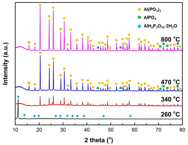그림 7은 열처리 온도에 따른 CBAPC_4.5의 XRD 결과를 나타냈다. 열처리 온도가 260 oC에서 CBAPC_4.5의 상은 AlH2P3O10·2H2O (JCPDS No. 31-0017)로 확인하였으며, 열처리 온도가 260 oC에서 340 oC로 증가하면서 CBAPC_4.5의 상은 Al(PO3)3 (JCPDS No. 13-264)와 AlPO4 (JCPDS No. 10-0423)인 것을 확인하였다. 470 oC와 800 oC 온도로 증가할수록 Al(PO3)3의 결정성이 증가함을 관찰하였다 [24-26]. CBAPC_4.5의 XRD 분석 결과는 D. Chen et al.과 H. J. Han et al.의 연구 결과와 앞선 TGA/DSC 분석 결과와 일치하는 것으로 확인되었다.