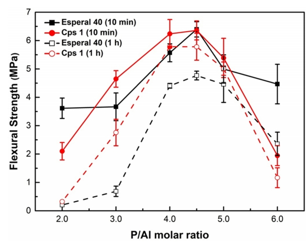 최대 강도를 나타내었으며, P/Al 몰 비가 2.0에서 4.5로 증가함에 따라 10분 강도는 3.61, 2.10 MPa에서 6.40, 6.36 MPa로