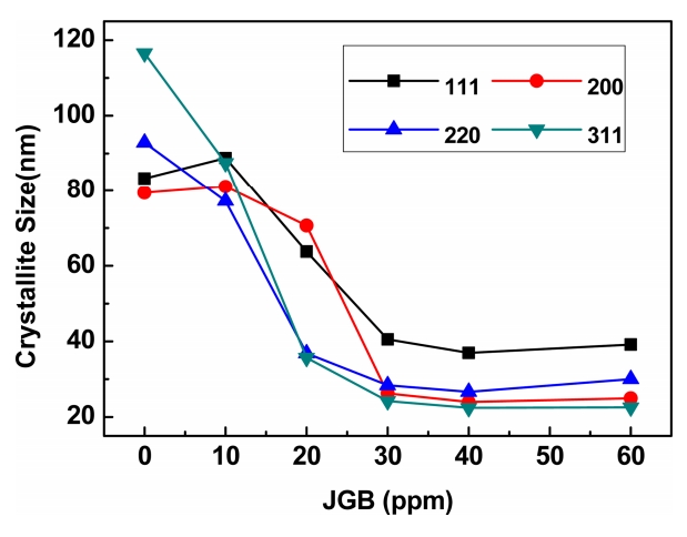 JGB 평활제 첨가로 전착층 표면에서 결정들이 성장하는 것을 억제하여 결정립 크기를 감소시켰고 (311), (220) 집합조직에서의 감소 현상이 두드러지게