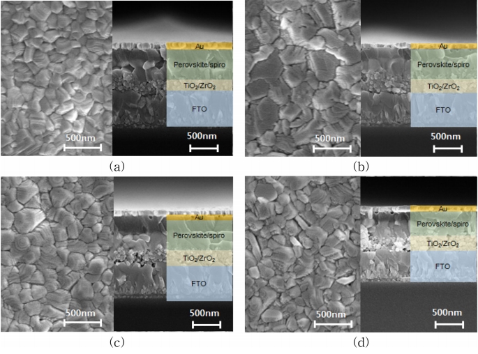 (d)는 288 nm ZrO2 층을 채용한 경우를 나타내었고, 페로브스키아트 결정립은 약 215 nm로 (a)보다 5% 감소된 것을 확인하였다. 페로브스카이트/스파이로 층의 두께는 약 457 nm로 (a)에 비해 15% 감소된 것을 확인할 수 있었다. 이는 과도한 ZrO2 층 채용에 따라 페로브스카이트 결정성장을 방해하여 나타난 결과로 판단하였다.