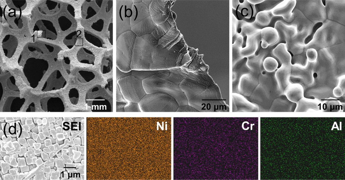 ๋ธ๋ก ํํ์ Ni-Cr-Al ํฉ๊ธ ๋ค๊ณต์ฒด์ ๊ธฐ๊ณต ๊ตฌ์กฐ์ ์ง์ฃผ(strut) ํ๋ฉด ํํ๋ฅผ ์ฃผ์ฌ ์ ์ ํ๋ฏธ๊ฒฝ (scanning electron microscopy,