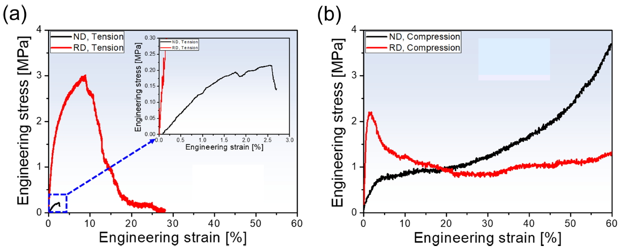 MPa์ ํญ๋ณต๊ฐ๋, RD ๋ฐฉํฅ์์๋ 2.18 MPa์ ํญ๋ณต๊ฐ๋๋ฅผ ๋ํ๋ด์๋ค. ์ฃผ๋ชฉํด์ผ ํ ์ ์ ND ๋ฐฉํฅ์ผ๋ก ์ธ์ฅ ๋ฐ ์์ถ ์ํ์ ํ ๊ฒฝ์ฐ, RD