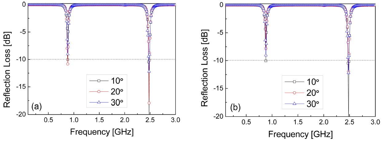 f1 = 0.88 GHz에서 –10 dB 수준, f2 = 2.48 GHz에서 –12 dB의 이하의 반사손실을 보인다. 그림 2의 시뮬레이션 결과와 잘 일치함을 볼 수 있고, 경사입사 특성 또한 우수함을 보여준다.