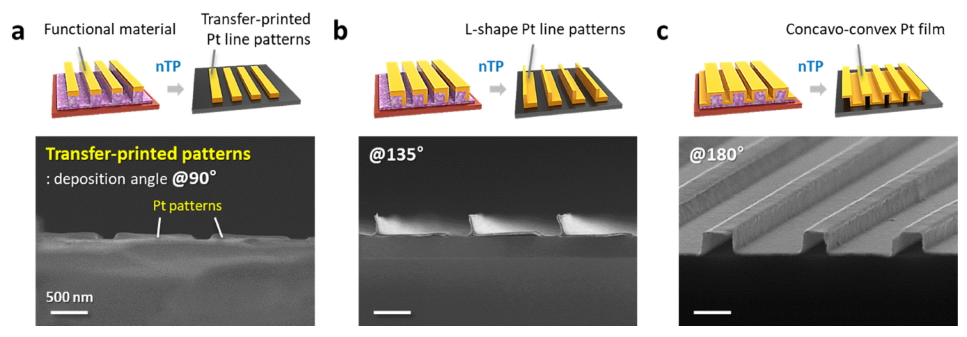 패턴이 구현 가능하다. θ가 90°일 때에는 복제패턴 위 돌출된 부분에만 국부적으로 증착된 Pt 소재가 라인 패턴으로 형성되었고 (그림 3a), θ가 135°일 때는 알파벳 L과 유사한 한 쪽이 솟아있는 모양의 라인 패턴이 형성되었으며 (그림 3b), 180°일 때에는 분리된 라인 형상이 아닌 모든 부분이 오르락 내리락을 반복하며 연결되어 있는 요철 모양의 필름 형상이 구현되었다 (그림 3c). 즉, 그림 3의 SEM 단면 이미지와 같이, 증착 각도를 조절하는 접근법을 통해 최종적으로 구현되는 패턴의 형상을 제어할 수 있다는 사실을 확인할 수 있었다.