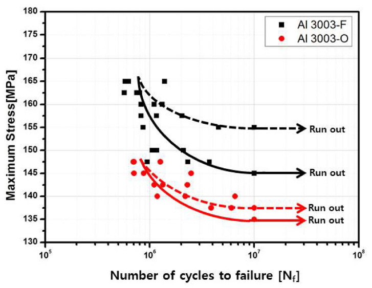 Strip cast Al 3003 ํฉ๊ธ ์ด์ฒ๋ฆฌ ์ (F), ํ(O) ์์ฌ๋ค์ ๊ณ ์ฃผ๊ธฐ ํผ๋ก ํน์ฑ ๊ฒฐ๊ณผ (S-N curve)๋ฅผ ๊ทธ๋ฆผ 11์ ๋ํ๋๋ค. ์ด์ฒ๋ฆฌ ์ ์์ฌ์ ํผ๋กํ๋๋ 145 MPa, ์ด์ฒ๋ฆฌ ํ ์์ฌ๋ 135 MPa๋ก ์ธก์ ๋์์ผ๋ฉฐ, ๋ชจ๋ ํผ๋ก ์๋ ฅ (fatigue stress)