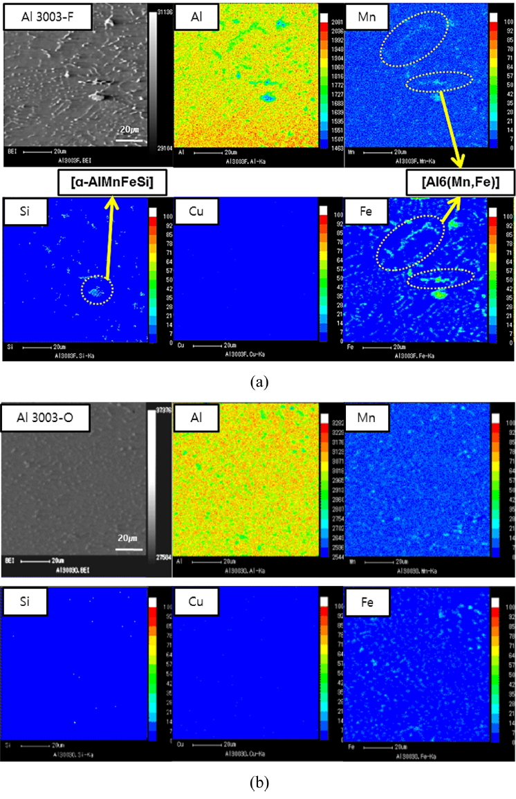 ํผ์ฌ๋ Al6(Mn,Fe) ์ ฮฑ(AlMnFeSi) ์์ ์ํด ํผ๋ก ๊ท ์ด ์ ํ ์ ํญ์ด ๊ท ์ผํ๊ฒ ์ด๋ฃจ์ด์ง์ง ๋ชปํ์๊ธฐ ๋๋ฌธ์ผ๋ก ์๊ฐ๋๋ค [24,25]. ์ด์ ๋ฐํด O ์์ฌ๋ ํผ๋ก ๊ท ์ด ์ ํ ๊ฑฐ๋์ด ๋ชจ๋ ์กฐ๋ฐํ๊ณ ๊ท ์ผํ ๊ฒ์ผ๋ก ๊ด์ฐฐ๋์๋ค (๊ทธ๋ฆผ 13(b)). ์ฆ, O ์์ฌ๋ F ์์ฌ์ ๋ฌ๋ฆฌ ๋ ๊ฐ์ง ํํ์ ํผ๋ก ํ๋ฉด์ด ์๋๋ฉฐ, ๋ชจ๋ ์์ญ์ด ๊ท ์ผํ ํผ๋ก ํ๋ฉด์ผ๋ก ๋ํ๋ฌ๋ค. ์ด๋ ์ด์ฒ๋ฆฌ ์ดํ ๊ฐํ์๋ค์