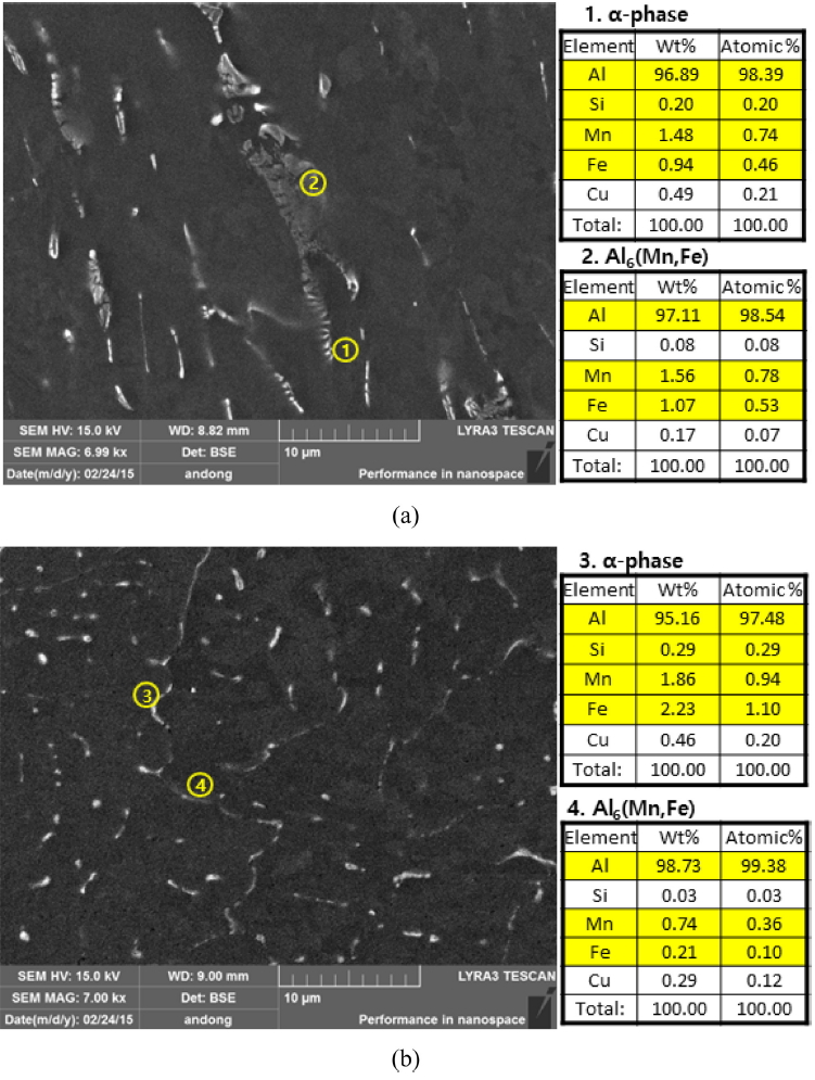 ๋น๊ต์์, ์ด์ฒ๋ฆฌ๋ฅผ ์ํํจ์ ๋ฐ๋ผ Al6(Mn,Fe) ์์ ํผํฌ ๊ฐ๋๊ฐ ์ปค์ง๋ ๋ฐ๋ฉด ฮฑ(AlMnFeSi) ์์ ๊ฐ์ํจ์ ์ ์ ์์๋ค.