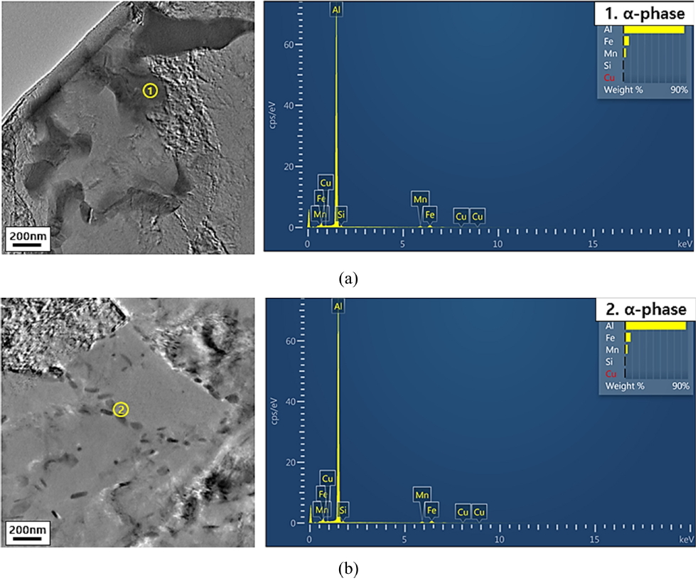 200 nm ์์ค์ ๋ฏธ์ธํ ฮฑ(AlMnFeSi) ์๋ค์ด TEM ๋ถ์์์ ์ถ๊ฐ๋ก ํ์ธ๋์๋ค. V. Hansen ๋ฑ [10]์ Al-Mn ๊ณ ํฉ๊ธ์์ Si ํจ๋์ด ๋ฎ์ ๊ฒฝ์ฐ ์ด์ฒ๋ฆฌ ํ ฮฑ(AlMnFeSi) ์์ ํฌ๊ธฐ๊ฐ 100 ~ 500 nm ์์ค์ผ๋ก ๋ฏธ์ธํด์ง ์ ์๋ค๊ณ