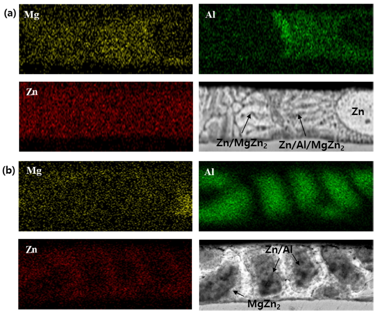 Al 및 Mg 조성에 따른 도금층 내 성분 분포를 알아보기 위해 A3M3 및 A15M3 시편의 단면을 EPMA를 활용하여 측정한 후 각각 그림 4(a) 및 (b)에 나타내었다. Al 및 Mg의 성분 분포를 통해 A3M3 도금층은 Zn 초정과 Zn/MgZn2 및 Zn/Al/MgZn2 공정상이 균일하게 분포하는 것을 확인 할 수 있으며 A15M3의 경우 앞서 언급된 바와 같이 조대 Zn/Al 공석상과 MgZn2 금속간화합물이 광범위하게 형성되어 있음을 확인 할 수 있다.