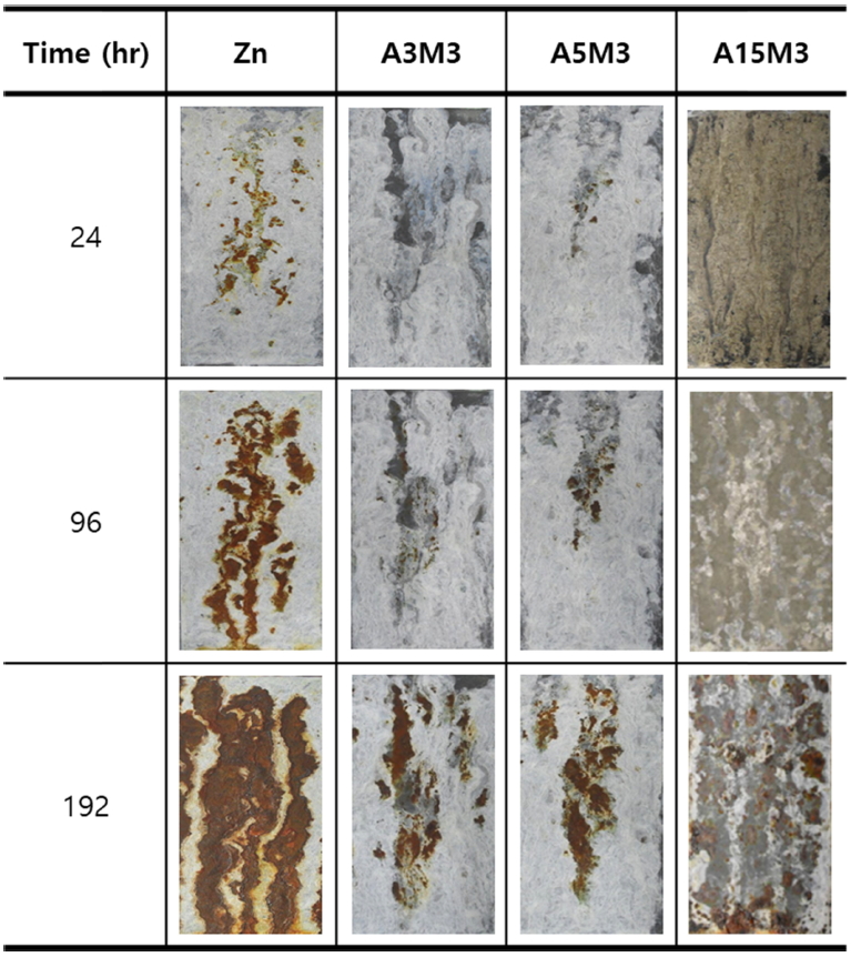 향상되는 경향을 보였다. Zn 도금재의 경우 SST 평가 8시간 경과 후 도금층 표면에 적청이 발생한 반면 A3M3 및 A5M3은 72 시간, A15M3은