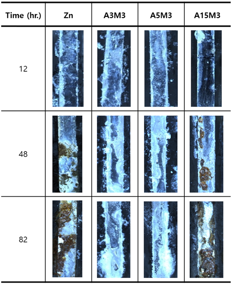 평가를 위해 100%Zn, 3%Al-3%Mg, 5%Al-3%Mg 및 15%Al-3%Mg 등 각각의 시험편을 절단한 후 SST 평가를 수행하였다. 시편