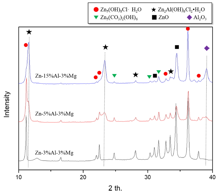 형성된 부식생성물과 비교 분석한 결과, Al 및 Mg 첨가에 의해 Simonkolleite peak의 강도가 매우 증가하는 경향이 관찰되었다. Simonkolleite는