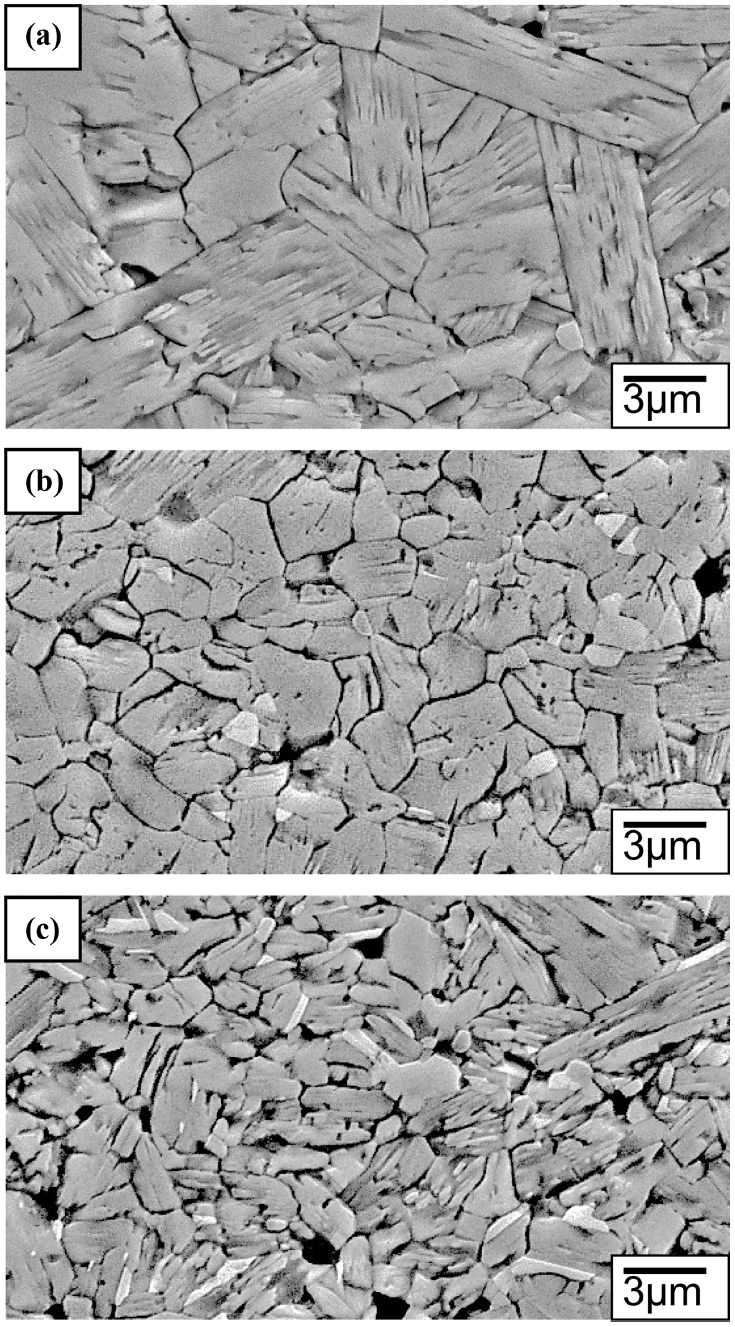 Figure 1 shows the SEM microstructures of synthesized Ti3AlxSi1-xC2. These specimens consisted of lamellar or somewhat equiaxed grains of micrometer