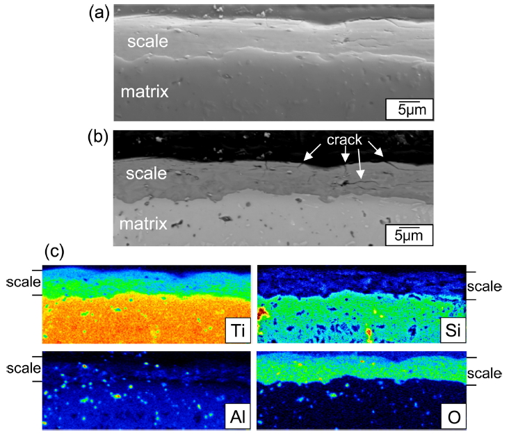 which could be recognizable from the location of SiO2 in the oxide scale (Fig 11c). Such resulted in the formation of the TiO2-rich oxide scale having rather uniformly distributed SiO2 and Al2O3, which was plausible considering that the ratio of Ti:Al:Si was 3:0.3:0.7.