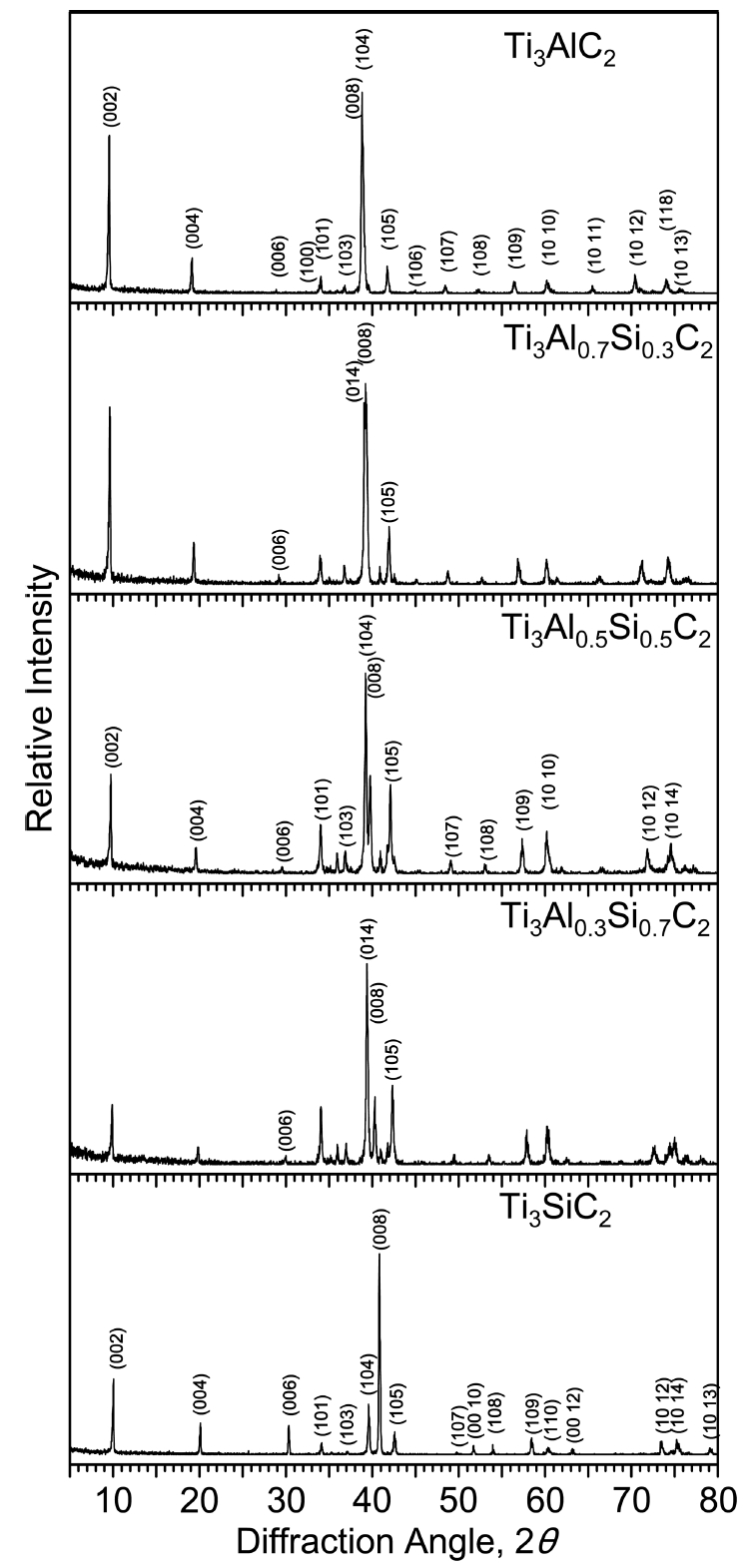 high Young’s moduli, high temperature strength, and high melting points. Ti3AlC2 and Ti3SiC2 form Ti3AlxSi1-xC2 solid solutions, which have attracted enormous interest for a number of applications