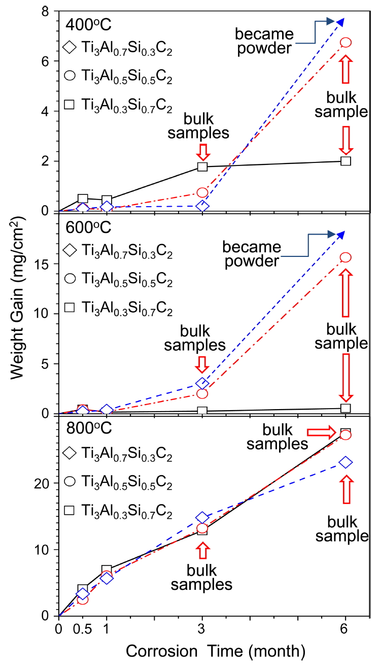 Figure 3 shows long-time oxidation curves of Ti3AlxSi1-xC2, which were obtained by measuring weight gains due to oxidation using a microbalance.